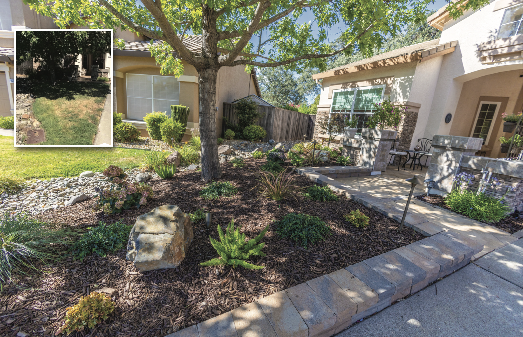 Take a look at the left side (see before photo). Rick just wanted us to remove the lawn and replace it with groundcover, however, there was no soil, and it was all tree roots. The only solution was to create a raised planter bed, so we could add more soil. By the time the roots of the new plants started to compete with the tree roots, they would be fairly established. However, adding the block to only one side of the yard left the overall design unbalanced. It was too heavy on the left. I shared my concern, both in design as well as the additional cost with Rick and Mary, and they were good with both. At this point, they now could see my vision, so it was much easier to spend the extra money. To this day, spending client’s money makes me nervous. I know in landscaping not all the steps are necessarily seen. You cannot foresee every difficulty you are going to encounter, and so the final cost is not always known. Also, in true design, the landscape begins to take on a life of its own. As you see elements coming together and complimenting each other, you see something, an idea that you did not see earlier. In starting