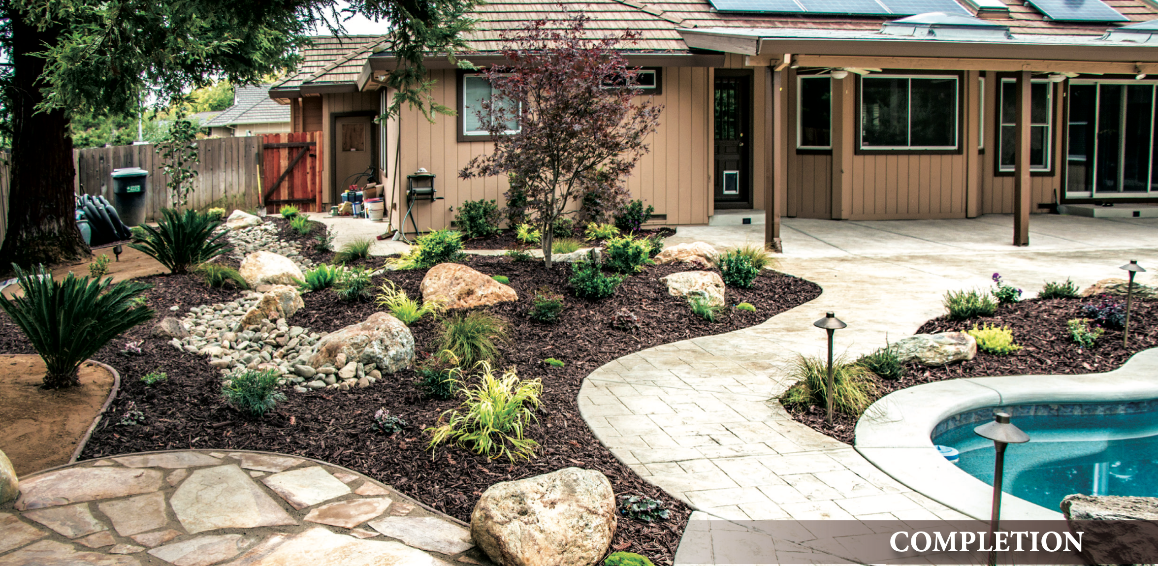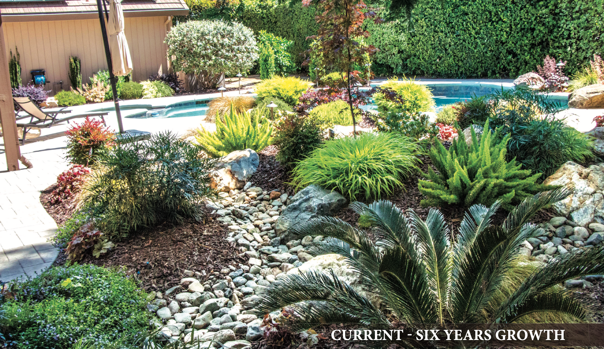 The featured landscape was a front yard and backyard job. For this article, we will discuss the backyard. I am going to limit my words so the pictures tell the story, however, there needs to be some guidance. The first image is pre-landscape, the second is during (down to the dirt), the third is completion, and the fourth is current, six years after completion. Hopefully, you can follow it. Each angle has the pool in it to help orient you to where you are in the yard. My favorite one is the third picture which allows a panoramic view from the flagstone patio to the house, although it lacks growth and detail. The fourth picture brings that in, showing a split dry riverbed and mature plants.