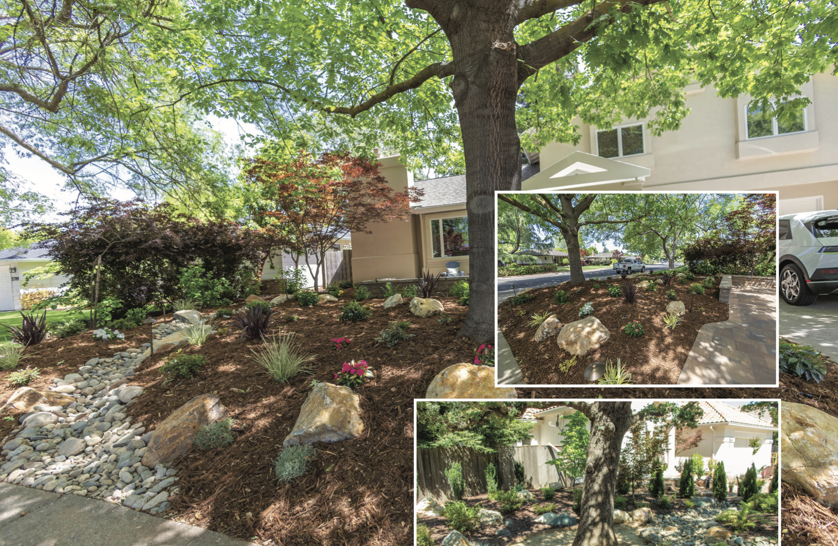 Prior to us landscaping, this area was lawn. This always concerns me because trees in lawns tend to be shallow rooted and are typically the trees that go down in the winter, unless they tap into deeper water sources. I believe this is what has occurred with this tree, as well as others in the neighborhood. The levee is right behind the home, so judging by its size, as well as the size of the other trees, I do believe they have tapped into the underground water table. Nonetheless, since we are changing the means of receiving a percentage of its water, we created a separate irrigation valve/station just for the three trees in the yard. A bubbler system will run about 3 hours every 8 to 15 days, depending upon the season. Aside from the deep watering, the trees will also pick up water from the drip irrigation. This is probably similar to what they received from the lawn.