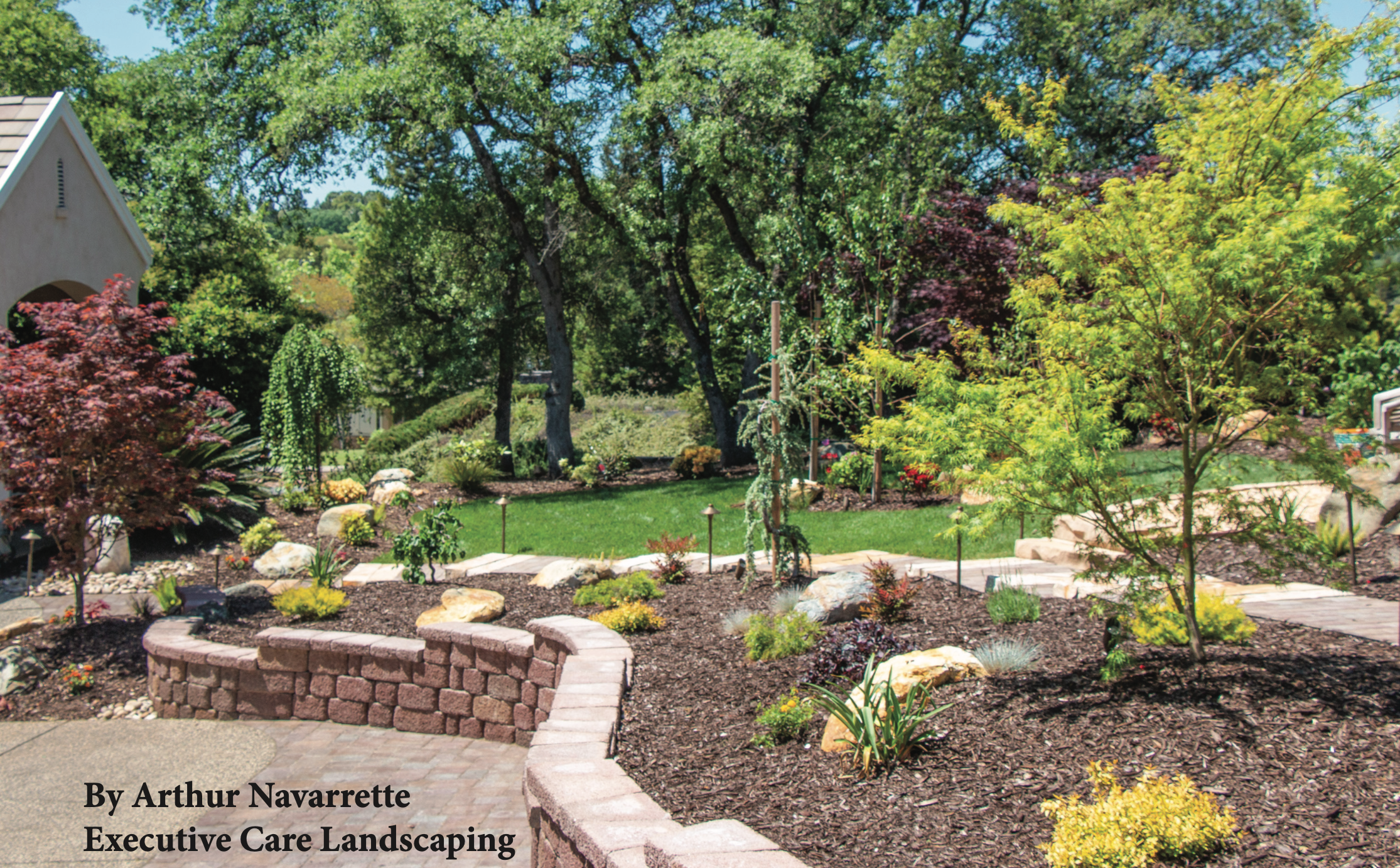 For this month, we are reshowing a landscape we featured in March. The landscape is in Auburn. At that time the trees were still deciduous. The job itself, however, was completed last October/November so when we showed it in March there had been virtually no growth. The pictures we featured just showed a lot of bark, wall, pavers, lawn and tiny plants. Now the trees have leafed out, giving more life to the land- scape. Next year, it will be a very nice landscape to feature again, however I wanted to complete the hardscape portion of this land- scape before we completely forget about what we covered in March. In the first article, I discussed the pavers and the wall (our articles are posted under publications on our website). The goal was to extend the driveway so that Ben and Kathleen could pull out and drive forward. Prior, they had to back up the hill to exit their driveway. To accomplish this change, we needed to cut the hill back, build the wall, and then fill in the newly acquired space with pavers. Both block and pavers were in the San Remo color style. This was the discussion in March, only in greater detail.