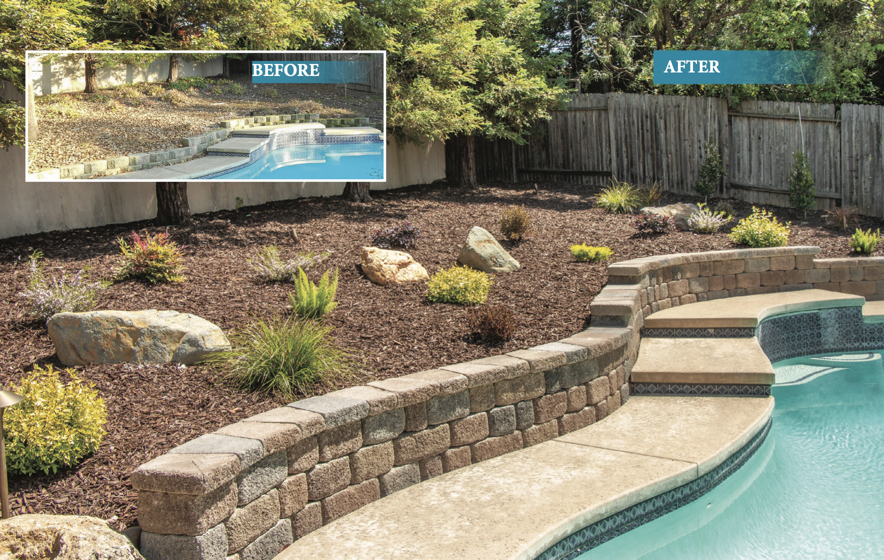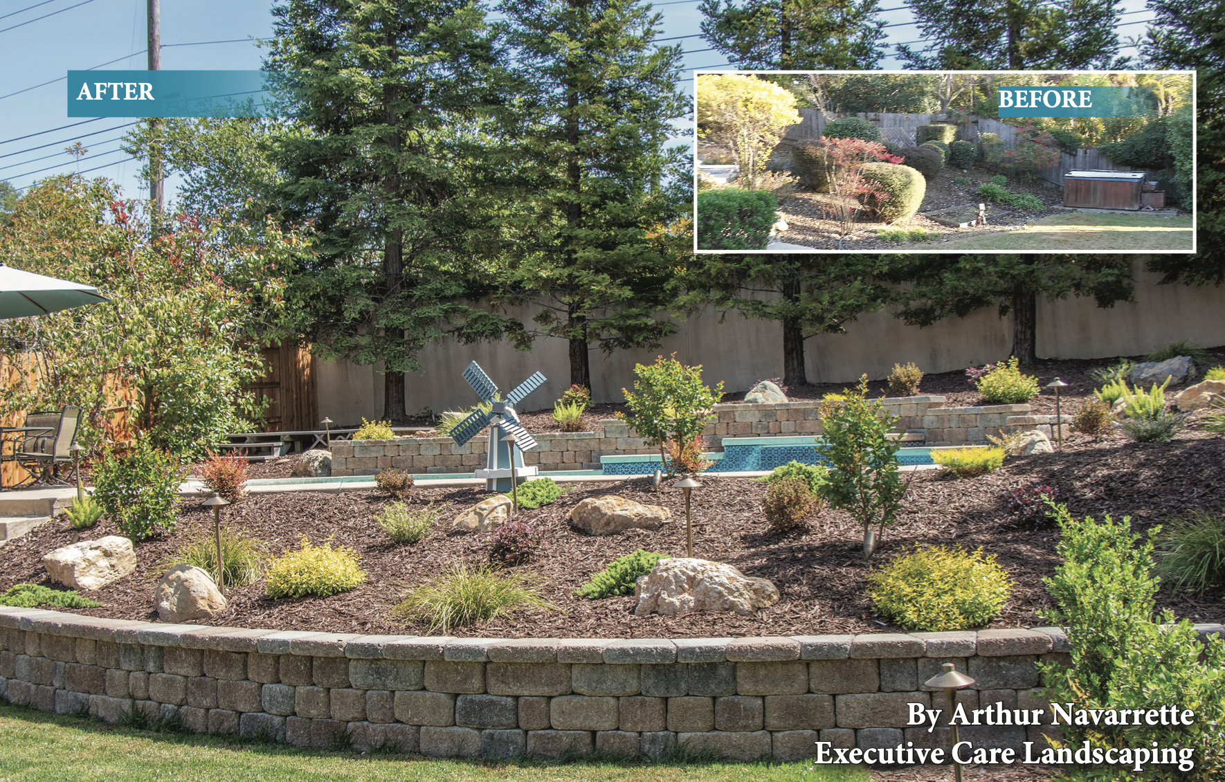 The job, as you can see in the before picture was not much to look at. It was not a retreat to go to, nor a sanctuary that you could enjoy your morning coffee. There was nothing about the landscape that invited you outside. There were only two things that were favorable: the pool and the Redwoods. Both the pool and Redwoods were far enough away that they really could not be appreciated from the home. You would have to be closer to the pool to appreciate that area. Our task, like all jobs is to take the existing strengths of the landscape and build on them. We also take the weaknesses and use them to our advantage. The greatest weakness of the yard was the slope. It was most un- pleasant in its prior form (worse than what can been seen in the before picture), however I learned long ago that an ugly slope is a gift if you know how to use it. A well landscaped slope allows you to see all its parts, there is nothing hidden or blocked. Also, it allows you to build retaining walls, and add topsoil blend. This lessens the steepness of the slope, but also makes it a great place for plants to thrive. Thomas’ job is only 3 months old, it was completed in February, so growth is just beginning. How- ever, next year at this time it is going to look completely differ- ent with the plants developing in accordance to their growth pattern. Right now, they are all basically the same size, and the Crape Myrtle trees are still deciduous and hard to see.