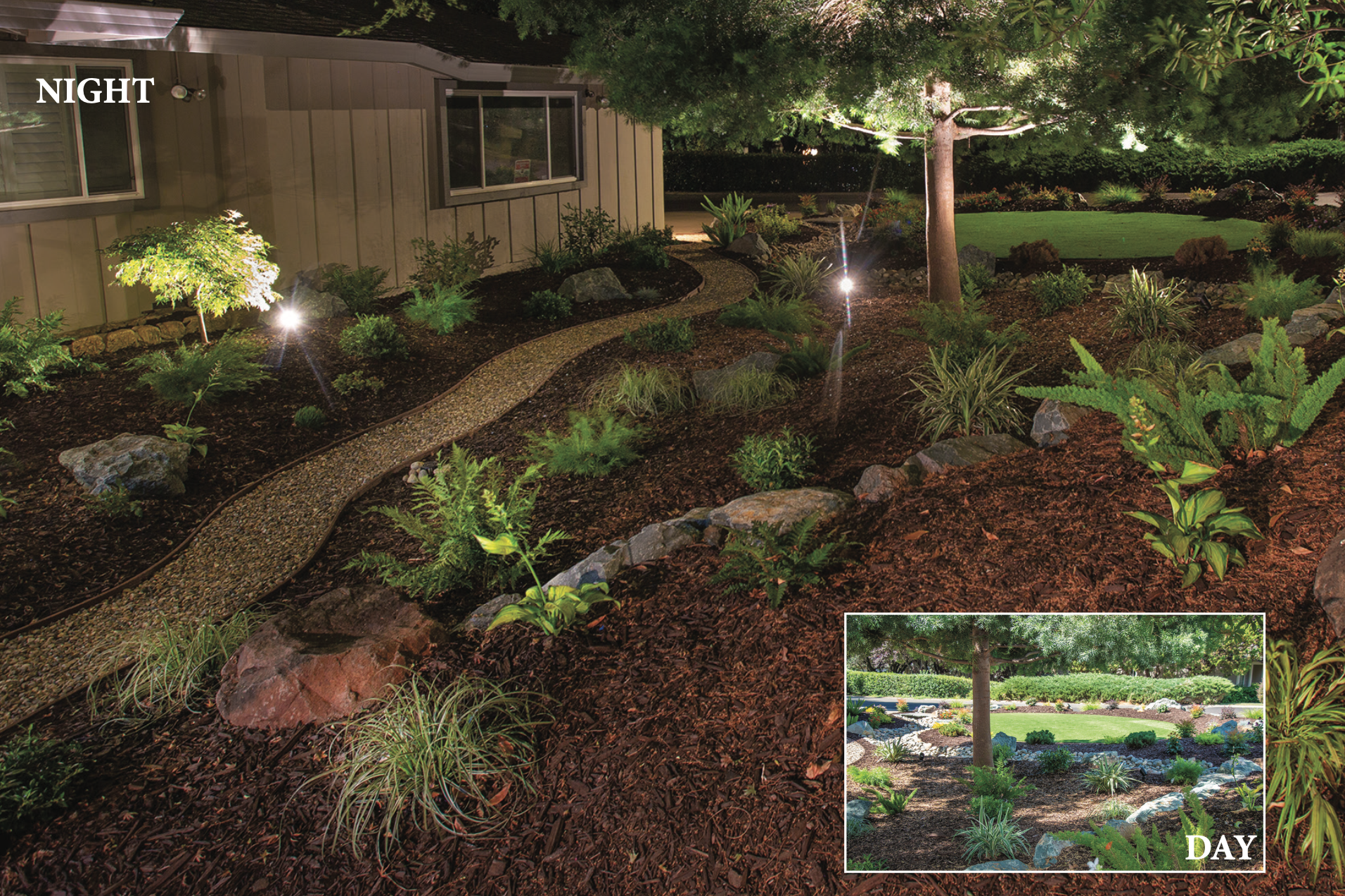 Path lights do what the name implies, they light up the path. The path can be the sidewalk leading to the front door, or a flagstone pathway lead- ing into the landscape or around the house. I sometimes use them around boulders in the landscape or alongside a dry stream bed. It’s a very nice look. It takes about three to four path lights to light up a stream bed compared to one spotlight, but I prefer this look be- cause the light is more controlled. It gives you the freedom to create little scenes with the light as opposed to taking a shotgun approach with a spotlight and lighting up everything. Doing some form of lighting for the stream bed is way better than doing nothing at all. Remember with lighting, darkness is your friend. You have to have the darkness for the contrast so what you are lighting pops.