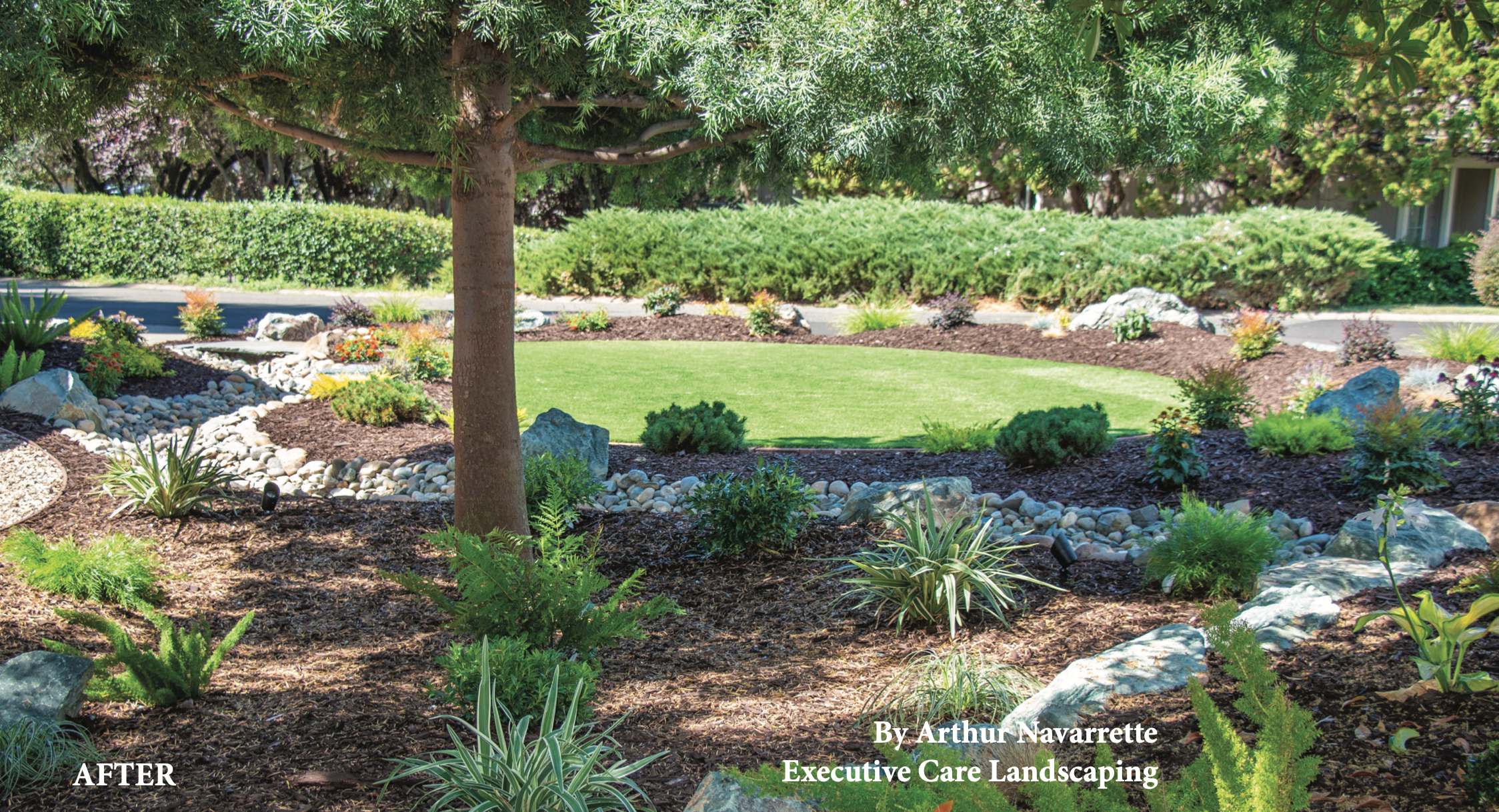 Aside from these “corner lot” problems, the original landscape was old and in need of a face lift. The combination of these needs made it a good time to redo the front yard (our before picture shows the lawn already removed). Our client’s landscape before was largely the traditional landscape, being mostly lawn. There is a corner island (see before picture) that several years ago had an Olive tree, which has since died. The other trees in the front yard, especially the one in the lawn had matured and now was shading out the lawn. Not only is too much shade detrimental to the lawn, but the roots of the tree competing for water stress- es it out. Although Roy liked lawn, the tree provided shade so he conceded that less lawn might be the wiser decision, and both Roy and Tangie were okay with using synthetic turf. The goal was to reduce the maintenance by keeping the mowing just to the back. Tangie was excited because with less space being allo- cated to the “lawn”, she would get to enjoy more plants and flow- ers along with the butterflies and hummingbirds they attract. Their son is young, and this would be a good way to support his interest in nature.